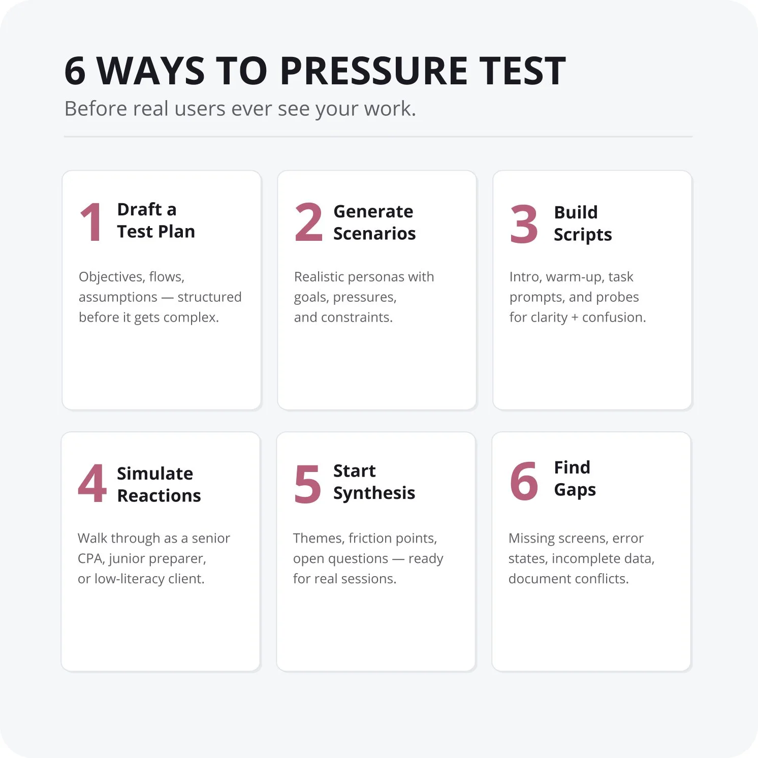 This is where AI adds the most value. I can ask it to respond as a senior CPA, a junior preparer, or a client with low financial literacy, and have it walk through the prototype narrating what is clear, what is confusing, where cognitive load spikes, where trust breaks, and where the workflow feels too manual or too automated.
