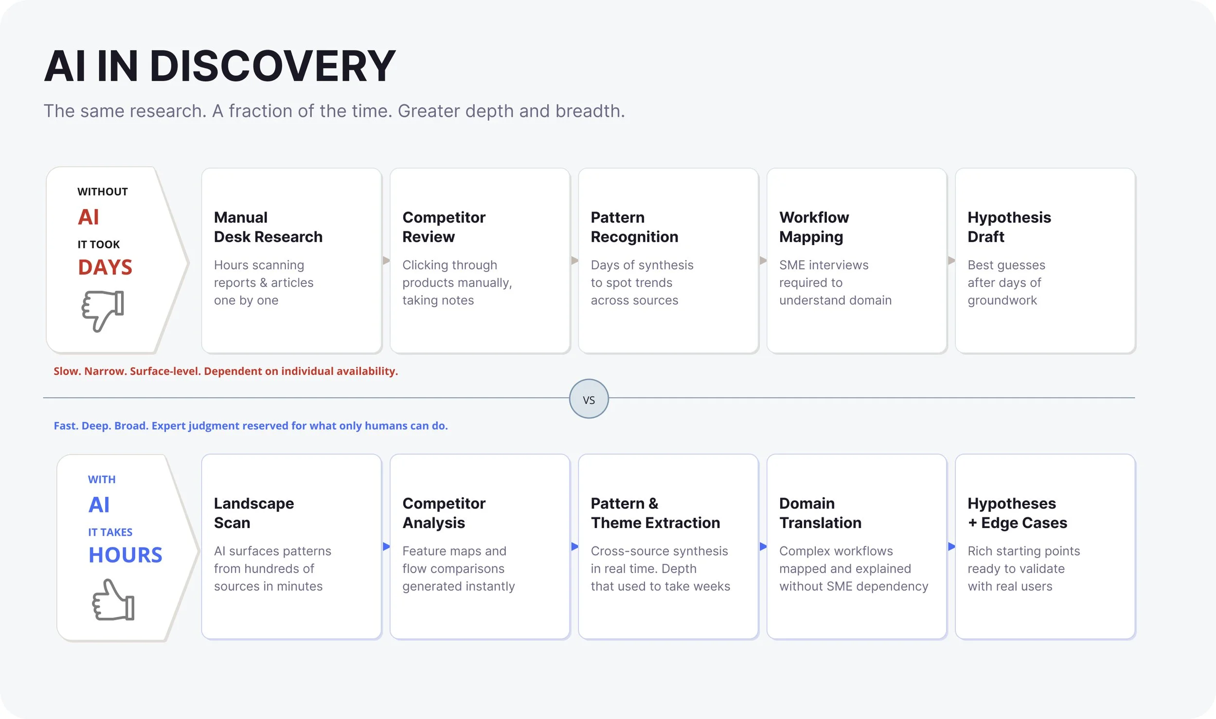 Competitive and workflow analysis that used to take days now takes hours, sometimes minutes. AI accelerates the path to clarity and helps identify where the real friction is before any design work begins.
