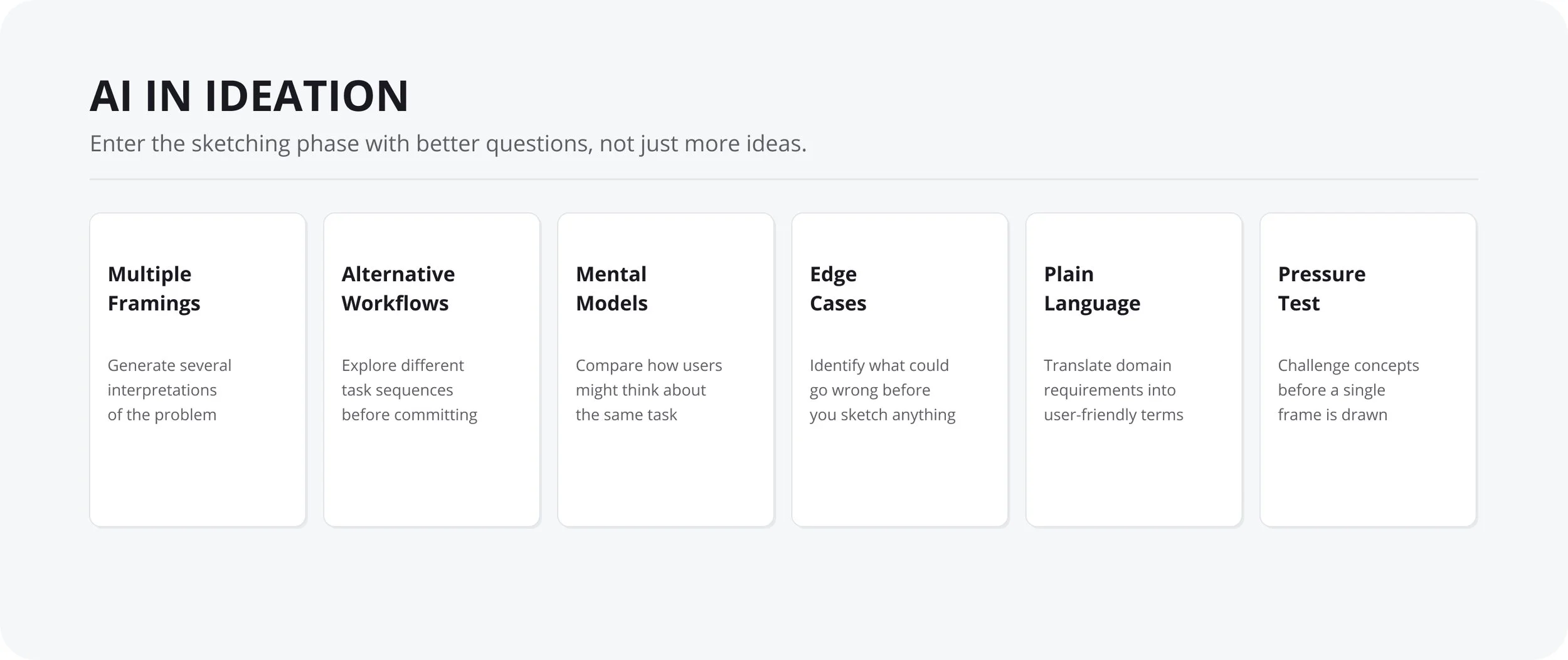 The goal is to enter the sketching phase with better questions, not just more ideas.